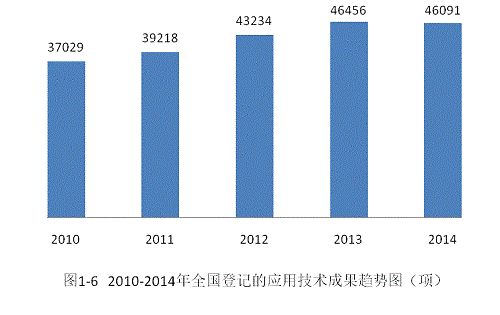 2014年全国登记的应用技术成果总量比上年略有降低。2014年全国共登记应用技术成果46091项,比上年下降0.79%,占全国登记成果总数的86.74%。    从近五年的情况来看,全国登记的应用技术成果总量前四年呈现平稳增长的趋势,每年约增长三千项左右,2014年略有降低。从2010年的37029项到2014年的46091项,五年间增长了24.47%(见图1-6)。