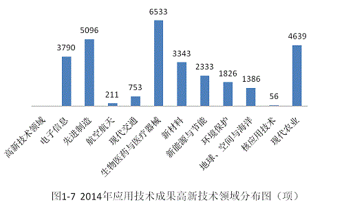 2014年登记的应用技术成果中,高新技术领域科技成果达到29966项,占应用技术成果总数的65.01%。高新技术领域成果主要分布在生物医药和医疗器械,先进制造,现代农业,电子信息等高新技术领域,这四个领域的应用技术成果达到20058项,占高新技术领域科技成果总数的66.94%(见图1-7)。
