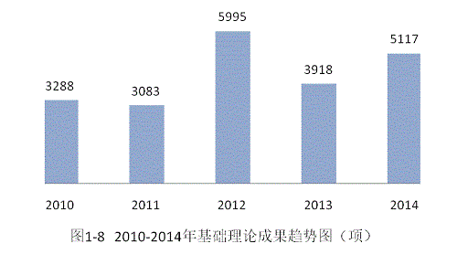 从近五年的情况来看,全国登记的基础理论成果总量呈现波动状态,2012年和2014年超过五千项,其中2012年最高,达到5995项,其他三年基本在三千多项。(见图1-8)。