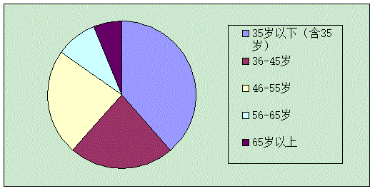 35岁以下(含35岁)511人,36-45岁305人,46-55岁309人,56-65岁120人,65岁以上83人