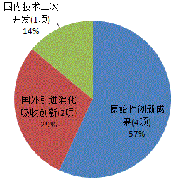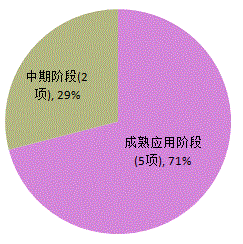 2015年登记应用技术类成果7项,占登记总数的54%。其中原始性创新成果为4项,国外引进消化吸收创新成果2项,国内技术二次开发成果1项(见图1a);5项成果处于成熟应用阶段,2项成果处于中期阶段(见图1b)。