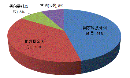 来源于国家科技计划的成果6项,占46%;地方基金项目成果5项,占38%(见图3)。