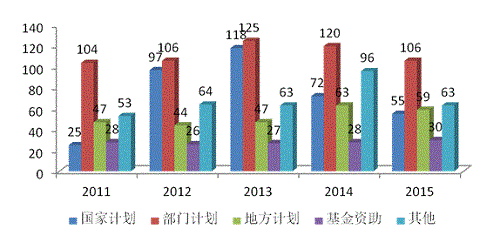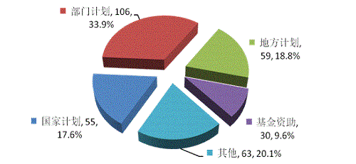2015年登记的科技成果以部门计划为主,共计106项,占登记总数的33.9%,比2014年减少14项。地方计划59项,占登记总数的18.8%,比2014年减少4项。国家科技计划55项(其中,科技基础性工作专项10项,科技支撑计划6项,高技术研究发展计划4项,科研院所技术开发研究专项资金4项,自然科学基金3项,重点基础研究发展计划2项,国家软科学研究计划2项,科技重大专项1项,星火计划1项,其他22项)占登记总数的17.6%,比2014年减少17项。基金资助科技成果(除国家基金以外的部门基金、地方基金、民间基金)30项,占登记总数的9.6%,比2014年增加2项。其他科技成果(包括横向委托、自选等)63项,占登记总数的20.1%,比2014年减少33项。(见图1-1、1-2)。