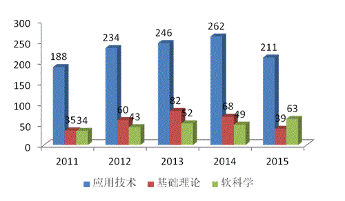 2015年登记科技成果按照成果类别划分可分为应用技术类、软科学类和基础理论类三种,其中,应用技术成果211项,占登记总数的67.4%,比2014年减少51项。软科学成果63项,占登记总数的20.1%,比2014年增加14项。基础理论成果39项,占登记总数的12.5%,比2014年减少29项。(见图1-3)。