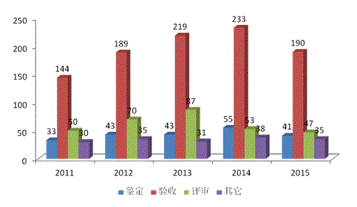 2015年登记的科技成果中,评价方式主要以验收为主,共190项,评审项目数47项,鉴定项目数41项,其他评价方式35项。今后,科技成果评价将更多地通过市场来检验,第三方评价等方式将逐步增多(见图1-4)。
