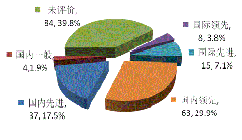 2015年登记的211项应用技术类成果中,水平达到国际领先的成果8项,占3.8%;达到国际先进的成果15项,占7.1%;达到国内领先的成果63项,占29.9%;达到国内先进的成果37项,占17.5%;达到水平一般的成果4项,占1.9%;未评价的成果84项,占39.8%。(见图1-5)。