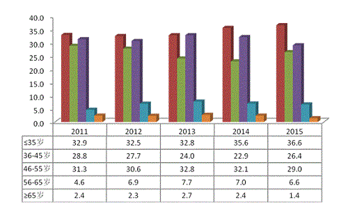 2011~2015年,≦55岁的人员中,≦35岁的人员比例有较大增加;36~45岁的人员呈先减少再增加态势,2014年为最少,只占到22.9%;46~55岁的人员保持稳定,在30%左右(见图1-7)。
