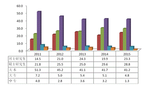 图1-8  2011~2015年科技成果完成人员学历结构(%)