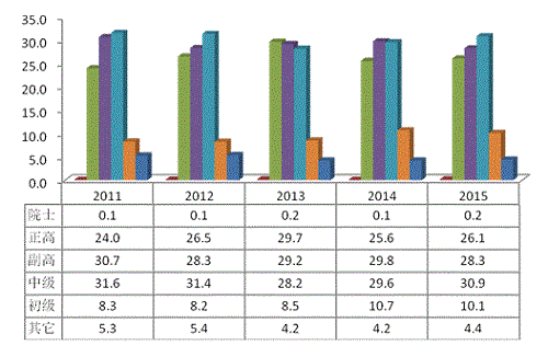 从职称构成看,主要集中在:中级,占比30.9%;副高,占比28.2%;正高,占比26.1%。“十二五”期间,正高的比重呈波动状,2013年比重最高,达到29.7%;副高的比重整体在28%—30%之间;中级人员比重整体在28%—32%之间(见图1-9)。