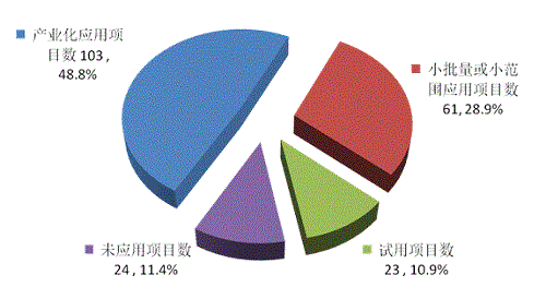 登记的应用技术类科技成果中,产业化应用项目数的科技成果保持着较高的比例,为103项,占48.8%;小批量或小范围应用项目数为61项,占28.9%;试用项目数为23项,占10.9%;未应用项目数为24项,占11.4%(见图2-1)。从总体上看,成果未应用的主要原因是政策因素、管理问题和资金问题,分别占33.3%、20.8%和16.7%。