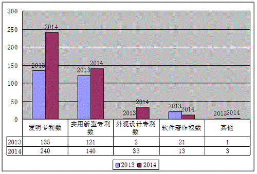 在登记的237项科技成果中鉴定项目数193项,验收项目数40项,行业准入数1项,评估项目数2项,结题项目数1项。数据表明,成果评价方式大多采取鉴定评价方式。2014年知识产权数共计429项,其中发明专利240项,实用新型专利140项,外观设计专利33项,软件著作权13项,其他3项。其中已授权专利248项。在248项已授权专利中,企业189项,独立科研机构13项,大专院校36项,医疗机构2项,其它8项。与去年数据对比分析, 数据显示今年的知识产权数有很大提升。