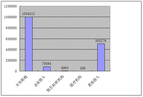 据统计,2014年登记成果的经费实际投入额为1591458万元,大专院校投入1004315万元,企业投入79584万元,独立科研机构投入为4060万元,医疗机构投入266万元,其他投入503276万元。其中大专院校经费投入较大,独立科研机构及医疗机构等单位经费投入较少。