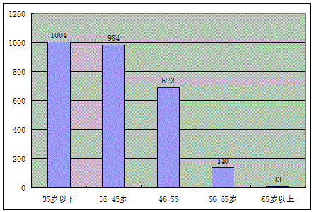 3、年龄结构:按科技成果完成人员年龄统计,35岁以下为1004人,36-45岁为984人,46-55岁为693人,56-65岁为140人,65岁以上为13人。数据表明,中青年科技人员是科技成果创造的主体,而35岁以下的青年科技人员逐步成为科技创新的骨干力量。