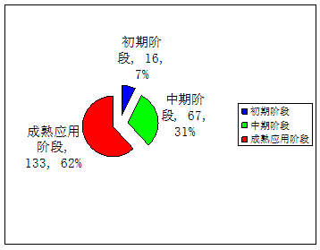 在登记的216项应用技术成果中,处于初期阶段的成果16项约占7%,中期阶段的成果67项约占31%,成熟应用阶段的成果133项约占62%,从统计数据看,大多数项目都已处在成熟应用阶段。