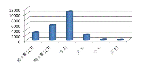 从文化程度看,2014年科技成果登记数据中,我省科技成果完成人员综合素质较高,本科以上学历占到了总数的89.5%。其中博士生2846人次,硕士学历5649人次,大学本科完成人员突破1万人次,达到10743人次。