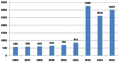 2014年陕西省共登记科技成果3015项,较2013年增长14.94%。从图1可以看出,“十二五”期间陕西省登记的科技成果总量较“十一五”时期增长明显,“十一五”时期平均每年登记的成果总量约为625项,而“十二五”期间(2011-2014)平均每年登记的成果总量约为2438项。