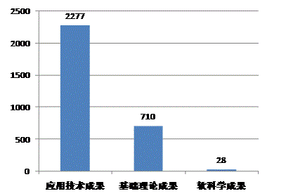 成果类别由应用技术成果、基础理论成果和软科学成果三类构成。2014年陕西省登记的科技成果中,应用技术成果2277项,占登记成果总数的75.52%;基础理论成果710项,占23.55%;软科学成果28项,占0.93%(见图2)。应用技术成果是登记成果的主体,但基础理论成果和软科学成果增速明显,分别较2013年增长486.78%和21.74%。