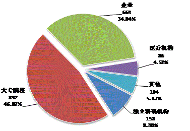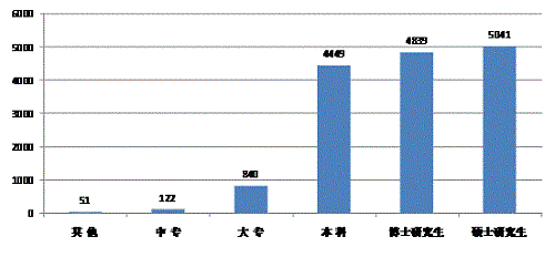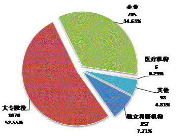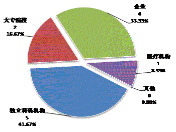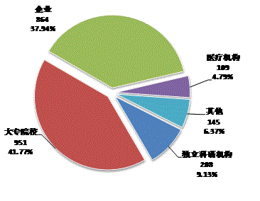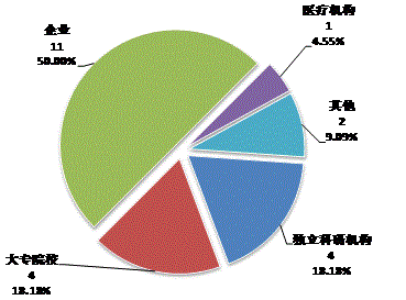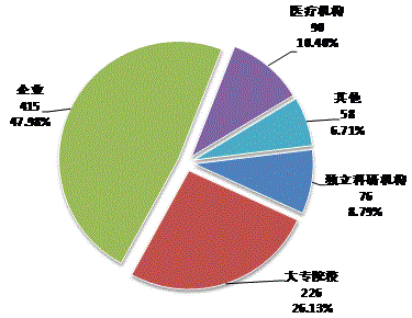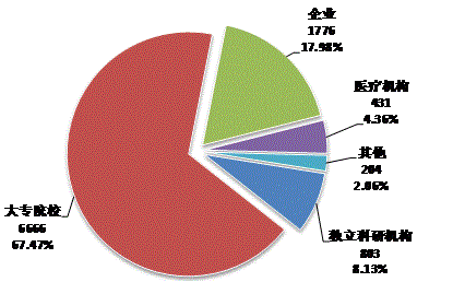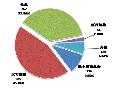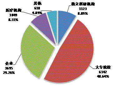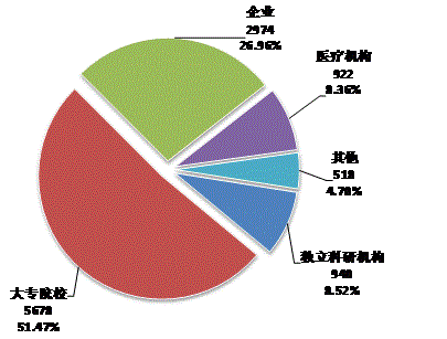 其中,拥有研究生以上学历(包括博士研究生和硕士研究生)人员主要集中于大专院校和企业,二者占研究生以上学历全部人次的85.45%(见图10)。然而,从成果产出率 上看,大专院校产出率相对较低(企业(0.49)>医疗机构(0.33)>独立科研机构(0.31)>大专院校(0.24))。