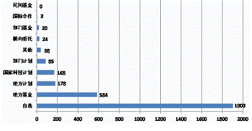 2014年陕西省登记的科技成果中,自选项目成果为1903项,占登记成果总数的63.37%;国家科技计划项目为168项,占5.59%;部门计划项目为85项,占2.83%;地方计划项目为178项,占5.93%;部门基金项目为20项,占0.67%;地方基金项目为584项,占19.45%;国际合作项目为3项,占0.10%;横向委托项目、其他项目分别为24项和38项,分别占0.80%和1.27%(见图4)。科技成果以自选项目为主,各级财政支持的各类计划项目成果仍占有较大的比重。与2013年相比,地方基金项目、国家科技计划项目和部门计划项目增幅较大,分别达到1258.14%、68%和44.07%。