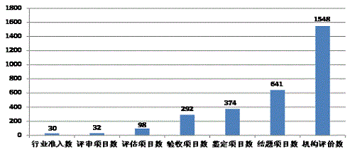 成果评价方式分为鉴定、验收、评审、行业准入、评估、机构评价和结题等7种。2014年陕西省登记的科技成果中,通过鉴定的项目374项,占登记成果总数的12.40%;验收项目292项,占9.68%;评审项目32项,占1.06%;行业准入项目30项,占1.00%;评估项目98项,占3.25%;结题项目641项,占21.26%;机构评价项目1548项,占51.34%(见图6)。其中,结题项目数和评估项目数较2013年分别增长681.71%和27.27%。评价方式呈现以机构评价为主,结题、鉴定和验收等其他评价方式发展较快的状态。
