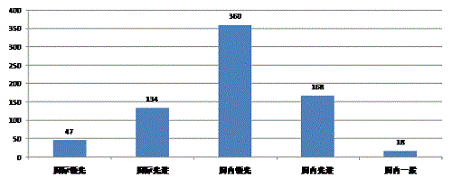 2014年陕西省登记的科技成果中,有1550项成果未进行成果水平评价。在进行了评价的727项成果中,国际领先成果47项,占成果水平评价成果总数的6.46%;国际先进134项,占18.43%;国内领先360项,占49.52%;国内先进168项,占23.11%;国内一般水平的科技成果18项,占2.48%(见图7)。科技成果总体评价水平是国内领先为主,国际领先有所增长,较2013年提高了2.55个百分点。