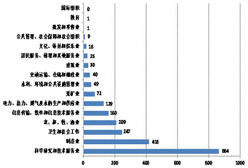 其中,应用于科学研究和技术服务业的有864项,占38.03%;制造业418项,占18.40%;卫生和社会工作247项,占10.87%;农、林、牧、渔业的成果有209项,占9.20%;信息传输、软件和信息技术服务业160项,占7.04%;电力、热力、燃气及水的生产和供应业129项,占5.68%;其他诸如采矿、交通运输、建筑等10个行业亦涉及有相关科技成果的应用。科学研究和技术服务业较2013年增幅较大,达到96.36%。