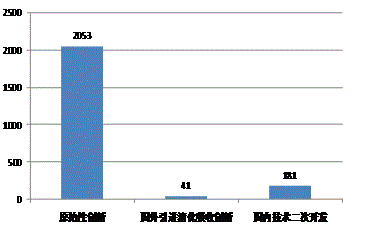 科技成果的属性分原始性创新、国外引进消化吸收创新和国内技术二次开发三类。2014年陕西省登记的应用技术成果中,原始性创新成果2053项,占登记应用技术成果的90.24%;国外引进消化吸收创新成果41项,占1.80%;国内技术二次开发成果181项,占7.96%(见图16)。与2013年(87.87%)相比,原始性创新成果所占比例显著提高。