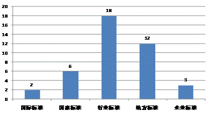 2014年陕西省共制定标准41项,其中国际标准2项,国家标准6项,行业标准18项,地方标准12项,企业标准3项(见图22)。