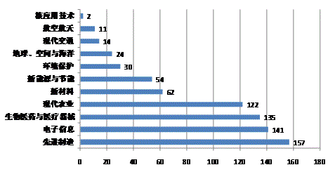 2014年陕西省登记的应用技术科技成果涉及11大高新技术领域,主要分布于先进制造、电子信息、生物医药与医疗器械和现代农业四大领域。其中,先进制造157项,电子信息141项,生物医药与医疗器械135项,现代农业122项,新材料62项,新能源与节能54项,环境保护30项,地球、空间与海洋24项,现代交通14项,航空航天11项,核应用技术2项(见图23)。