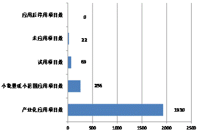 2014年陕西省登记的应用技术科技成果中,99.03%的项目都被应用。其中,稳定应用的成果比例最高,项目达1930项,占应用技术科技成果总数的84.76%;小批量或小范围应用256项,占11.24%;试用项目69项,占3.03%;未应用的项目是22项;没有应用后停用的项目(见图24)。
