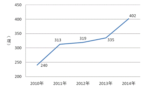 2014年度全省共登记科技成果402项,较上年增长20%。从2010至2014年,科技成果登记数量五年增幅明显,如下图1所示,2014年较2010年登记成果增加162项,增幅为67.5%。