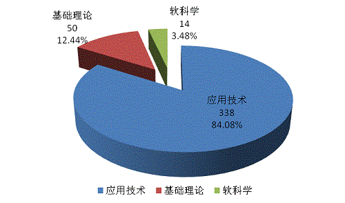 402项科技成果中,如下图2所示,应用技术成果338项,占84.08%,较上年增长6.17%;基础理论成果50项(占12.44%),软科学成果14项(占3.48%),后两类成果较上年均略有下降。