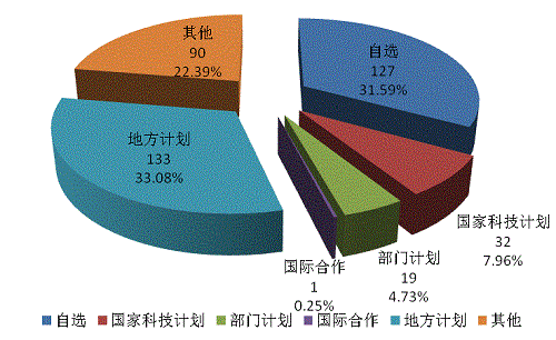 402项科技成果中,地方计划仍为主要来源,达到133项,占33.08%;自选项目127项,占31.59%;国家科技计划32项(科技支撑计划7项、科技重大专项6项、自然科学基金6项、国际科技合作专项2项、科技型中小企业技术创新基金2项、科研院所技术开发研究专项资金2项、重点基础研究发展计划1项、星火计划1项、火炬计划1项、国家软科学研究计划1项、其他3项),占7.96%;部门计划19项,占4.73%;国际合作1项,占0.25%;其他厅局计划成果90项,占22.39%。(见图3)