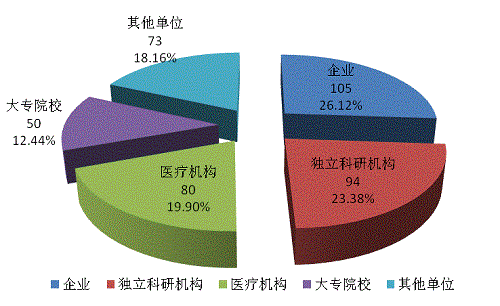 402项科技成果中,企业居成果完成主体的首位,达105项(其中科研转制型企业完成10项),占26.12%,较上年增长6%;独立科研机构完成94项,占23.38%;医疗机构完成80项,占19.90%;大专院校完成50项,占12.44%;其它单位完成73项,占18.16%。(见图4)