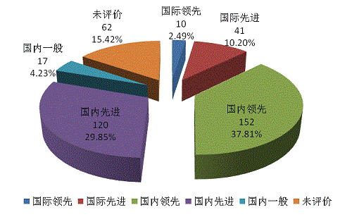 402项科技成果中,国内领先及以上水平的共203项,约占总数的一半。图5可以看出,达到国际领先水平的成果10项,占2.49%;达到国际先进水平的成果41项,占10.2%;达到国内领先水平的成果152项,占37.81%,达到国内先进水平的成果120项,占29.85%;国内一般水平的成果17项,占4.23%;未评价水平(主要为行业准入类成果)62项,占15.42%。