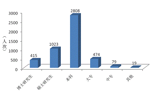 1.从学历构成来看,图6表明,我省的科技工作者队伍仍主要以大学本科及以上学历构成。博士研究生、硕士研究生、本科生共4246人次,占88.13%;大专为474人次,占9.84%;大专以下文化程度为98人次,占2.03%。