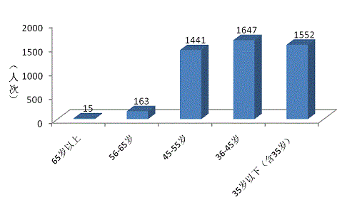 2.从年龄结构来看,图7表明,中青年是科技成果研究人员的主体。55岁以下的科研人员4640人次,占96.31%, 其中35岁以下的科研人员为1552人次,36-45岁之间的科研人员为1647人次,46-55岁之间的科研人员为1441人次,56岁以上科研人员为178人次,仅占3.69%。