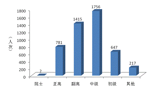 3.从技术职称来看,图8表明,具备中级以上技术职称的科研人员为3954人次,达82.07%,占据了科研人员的主要比例,初级职称者为647人次,占13.43%,其他科研人员217人次,仅占4.5%。