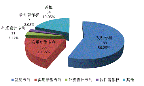 1.纵向看,从年度划分,2014年度形成知识产权336件,数量快速增长,是2013年的2.8倍。知识产权结构不断优化,发明专利达189项,占知识产权数的56.25%,实用新型专利65项,外观设计专利11件,软件著作权7项,其他(发表SCI论文)64项。(见图9)
