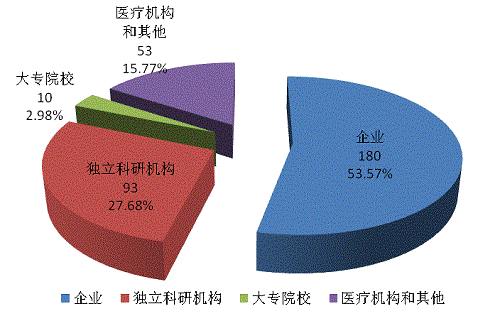 2.横向看,从主体划分,企业形成知识产权180件(占53.57%),是专利创造主力军;独立科研机构93件(占27.68%);大专院校10件(占2.98%);医疗机构和其他共有53件(占15.77%)。(见图10)