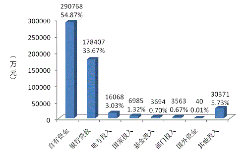 402项成果的经费总投入529896万元。如图12所示,其中自有资金290768万元,占总投入的54.87%;银行贷款178407万元,占33.67%;地方科技部门投入16068万元,占3.03%;国家投入6985万元,占1.32%;基金投入3694万元,占0.7%;部门投入3563万元,占0.67%;国外资金40万元,占0.01%;其他投入为30371万元,占5.73%。