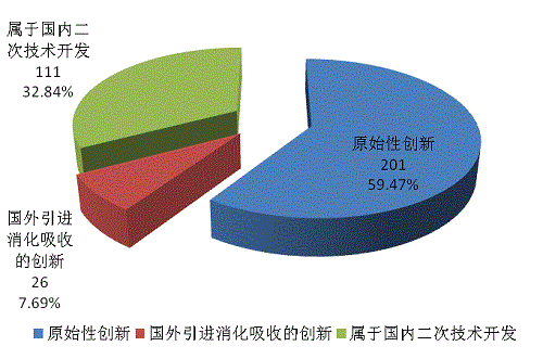 338项应用技术成果中,按照成果属性占比从高到低排列依次为:属于原始性创新的成果过半(占应用技术成果数的59.47%),达到201项;属于国内二次技术开发成果111项,占32.84%;属于国外引进消化吸收的创新成果26项,占7.69%。(见图12)