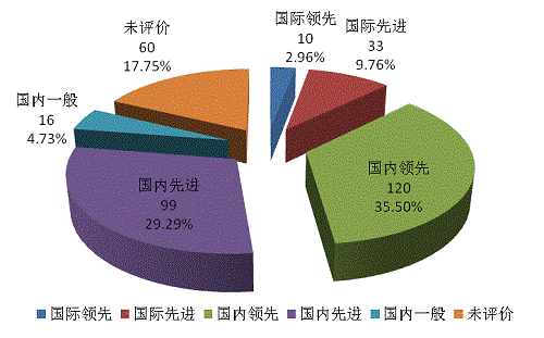338项应用技术成果中,图13表明,按照成果水平占比从高到低排列依次为:国内领先水平120项(占35.5%),国内先进水平99项(占29.29%),未评价水平60项(占17.75%),国际先进水平33项(占9.76%),国内一般水平16项(占4.73%),国际领先水平10项(占2.96%)。