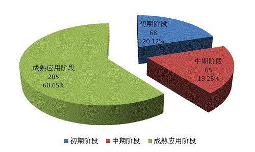 338项应用技术成果中,如图14所示,处于成熟应用阶段的成果205项,占60.65%,初期阶段成果68项,中期阶段成果65项。