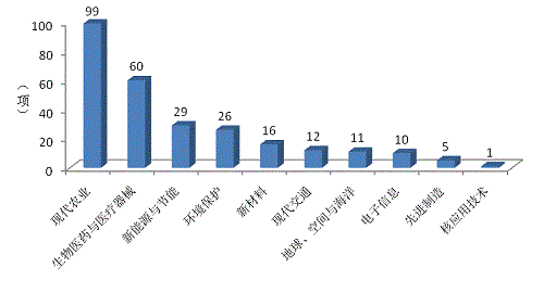 338项应用技术成果中,有269项属于高新技术领域,占应用技术成果总数的79.59%。如图15表明,269项成果分布在10个高新技术领域内,主要体现在四大高新技术领域,按照成果数由高到低排列依次是:现代农业99项(占比36.8%)、生物医药与医疗器械60项(占22.3%)、新能源与节能29项(占10.78%)、环境保护26项(占9.67%),这四个领域成果占全部高新技术领域科技成果的79.55%。