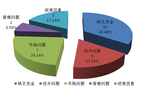 下图17显示,分析29项未应用成果的原因得知,资金缺位仍是主要问题,同时受到多种因素综合影响。进一步统计表明:由于缺乏资金造成未应用10项,占未应用成果的34.48%;市场问题造成未应用的成果7项,占24.14%;技术问题造成未应用的成果5项,占17.24%;其次是由于政策因素、管理问题造成未应用的成果分别为5项、2项,占比较低,分别为17.24%、6.9%。