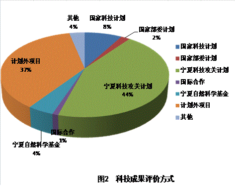 206项科技成果项目的评价方式中,由科技厅组织的科技计划验收93项;由宁夏科技成果管理中心组织的计划外成果鉴定80项;评审19项;由自治区农作物品种审定委员会审定的农作物品种行业准入14项;(见图3)。