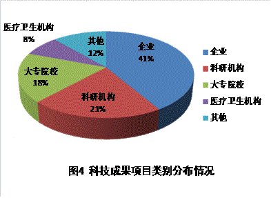 按完成单位分类,206项成果中由企业完成的85项、科研机构完成的43项(其中科研机构转制型企业完成的6项)、大专院校完成的38项、医疗卫生机构完成的16项、其他单位完成的24项(见图4)。