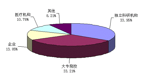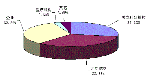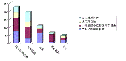 完成单位中,企业以产业化应用的科技成果为主,分别占各自应用技术成果数的59.26%。大专院校和医疗机构以小批量或小范围应用项目为主,分别占各自应用技术成果数的36.60%和71.88%(见图9)。独立科研机构的产业化应用项目和小批量或小范围应用项目占其应用技术成果数的比例都很高,分别为32.74和37.57%。