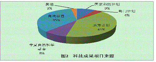 所登记的244项科技成果中,属于国家科技计划的项目共22项,其中科技重大专项1项、自然科学基金项目14项、科技支撑计划2项、星火计划1项、科技型中小企业技术创新基金2项、其他2项;部门计划10项、地方计划99项、地方基金20项、国际合作1项、横向委托1项、自选项目86项、其他5项(见图2)。